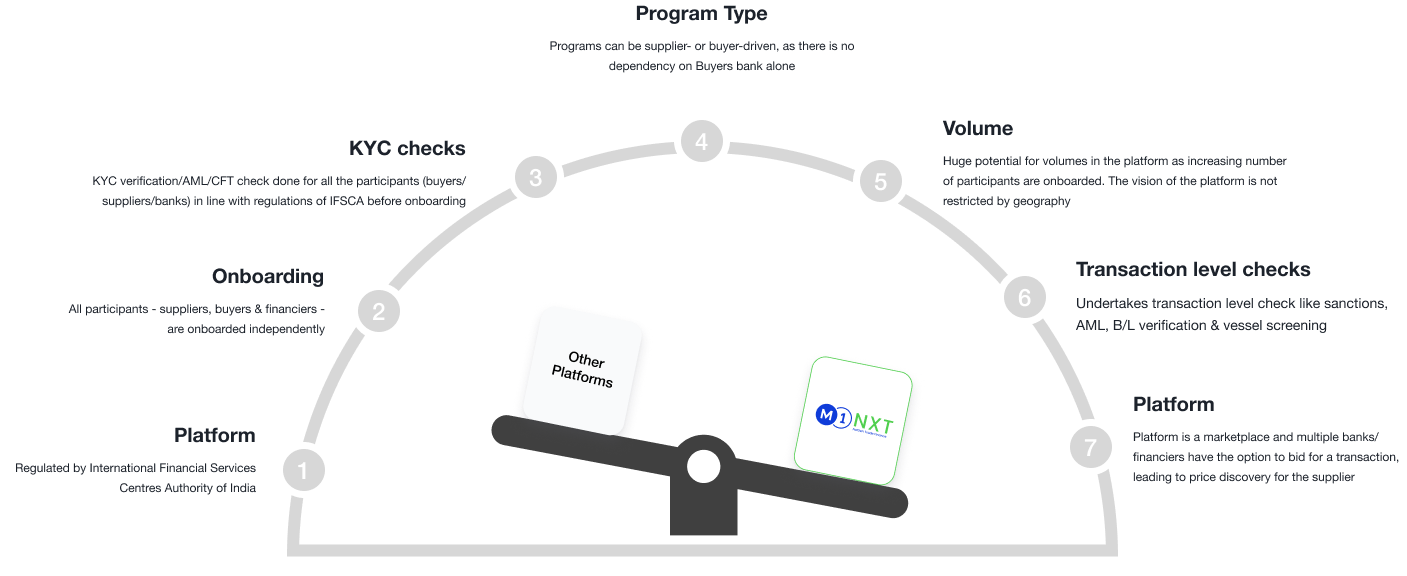 M1 NXT is an innovative International Trade Financing Services (ITFS) platform, proudly regulated by IFSCA in GIFT City, Gandhinagar. As a pioneering subsidiary of M1xchange, we are dedicated to transforming cross-border trade finance. Our digital platform champions innovation and transparency, providing seamless working capital solutions for businesses engaged in international trade.